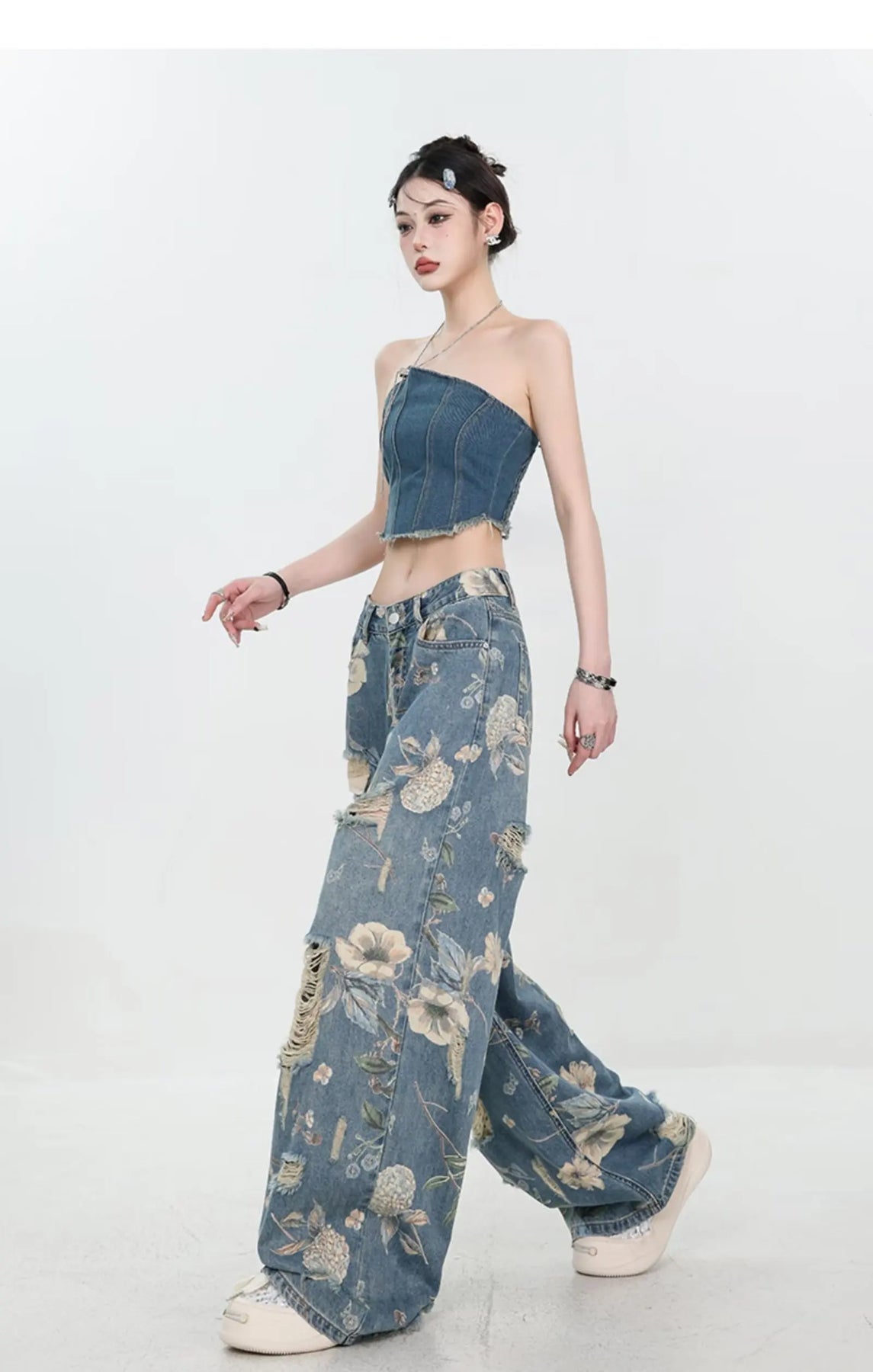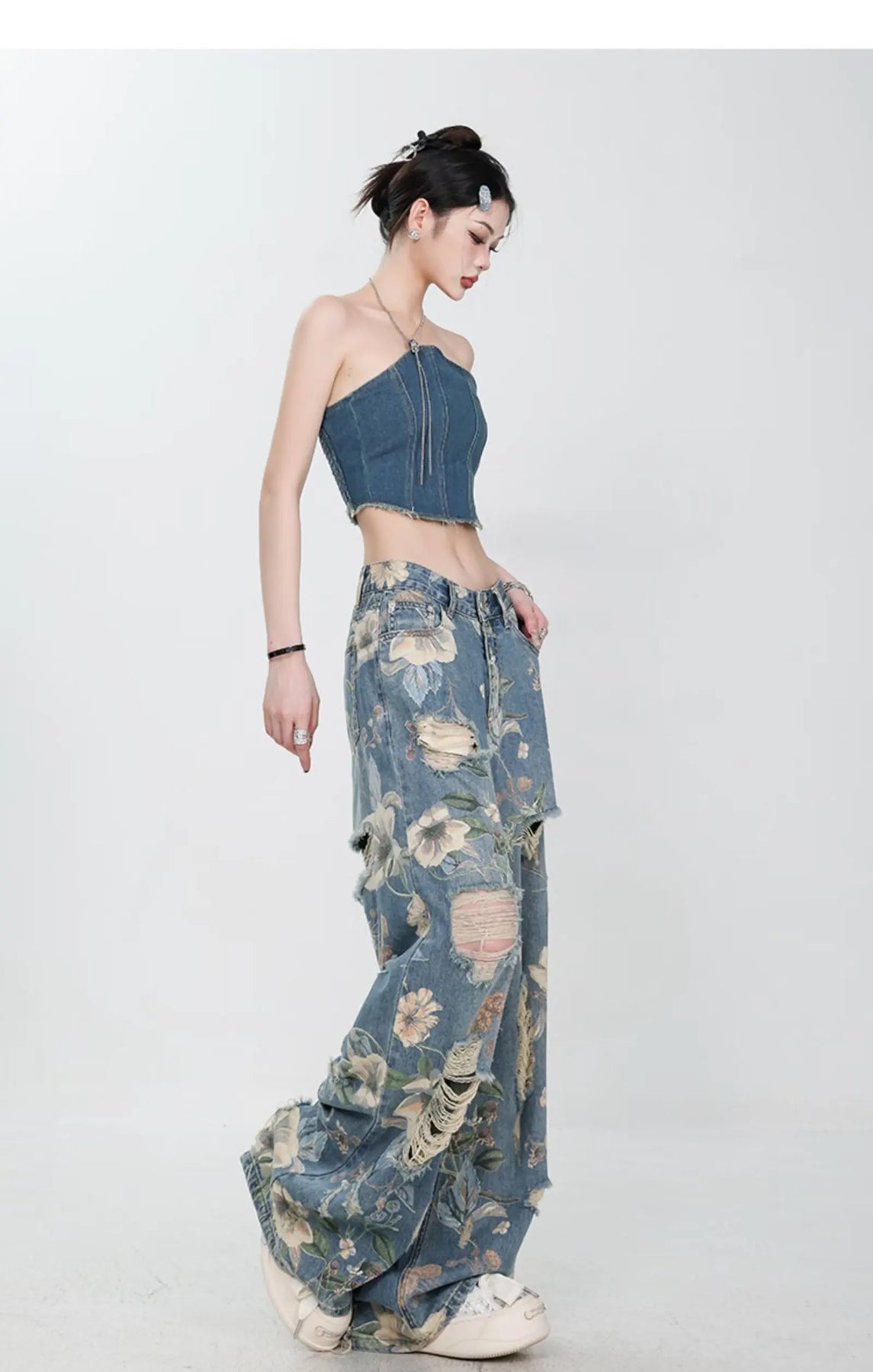 Flourish in chaos with these floral wide-leg jeans, ripped to perfection for lived-in, street-chic vibes, style them with your favorite top for a laid-back look.